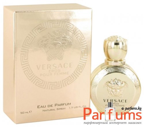 Женский аромат, посвященный богу любви Эросу, является парой к аналогичному мужскому. Округлая бутылочка, украшенная барельефом с изображением Медузы Горгоны, делает флакон символически греческим и удивительно стильным. Металлические диски и золотистые элементы дополняют вид бутылочки. Над созданием этого букета работало трио лучших парфюмеров современности Alberto Morillas, Olivier Cresp и Nathalie Lorson. Так, им удалось создать соблазнительный, невероятно чувственный, сложный аромат Versace Eros. В нем присутствует сочные ноты фруктов, деликатность цветов, бархатистая база. Это композиция, в которой нет неординарных сочетаний, однако удивительная соблазнительность сформирована классическим сплетением нот. Оттенки искристого лимона и бергамота дополняются сочным гранатом в вершине. В сердце им вторит великолепие жасмина, благоухание пиона и деликатность цветка лимона. Великолепная база Versace Eros составлена из древесных аккордов, мускуса и сандала. Эта, казалось бы классическая композиция, способна будоражить чувства, пробуждать неизведанные ранее желание.